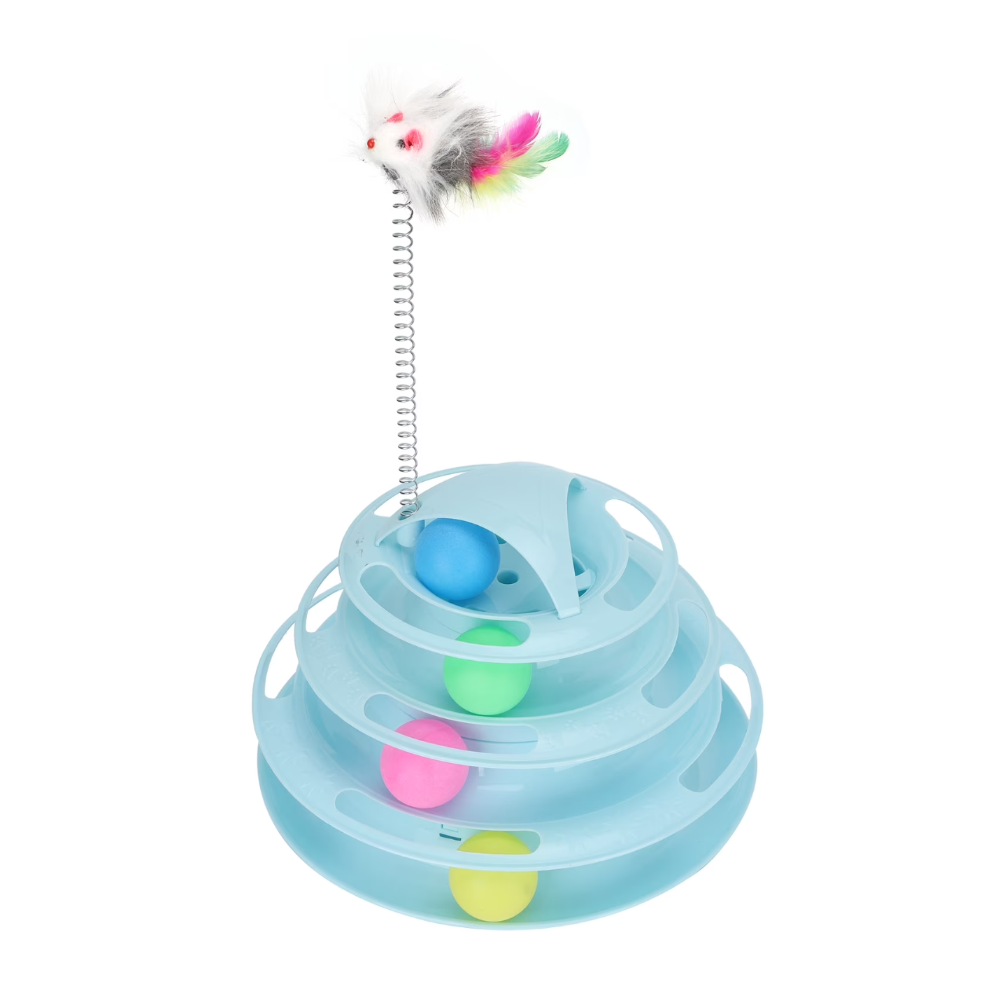 4-level interactive cat tower toy featuring rolling balls within tracks and a feather wand teaser on top.