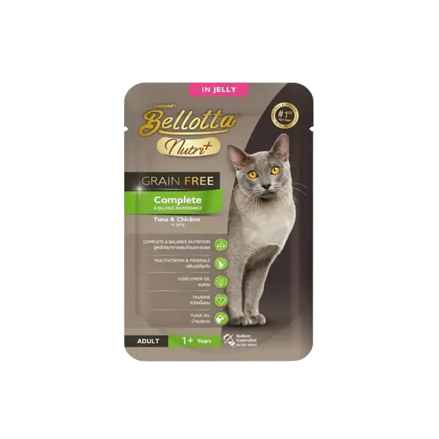 Bellotta Nutri Plus Grain-Free Pouch Complete Tuna & Chicken Jelly 70gm is a high-quality wet food designed to provide balanced nutrition for cats of all ages. This grain-free recipe is crafted with premium tuna and chicken, ensuring a protein-rich meal that supports muscle development and overall health.