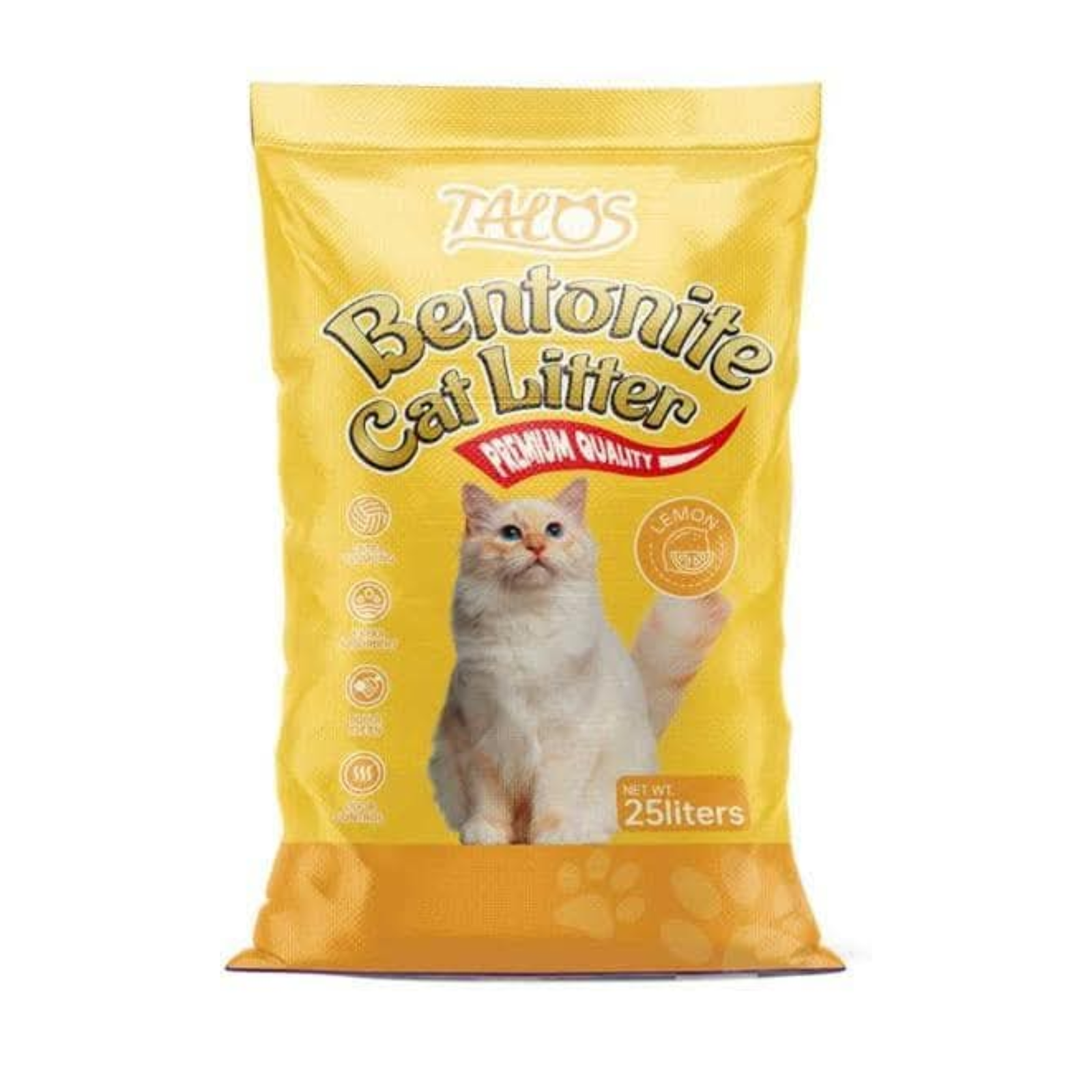 The image shows Talos Premium Bentonite Cat Litter, a clumping litter product from ACI Pet Care. It is primarily available in scent, as indicated by the yellow packaging and label in the photo.